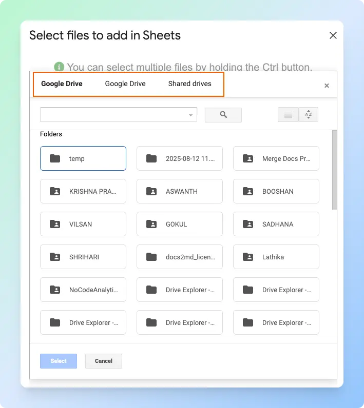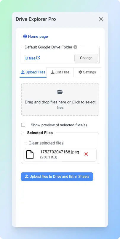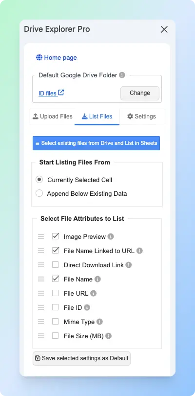 In the List Files tab, click Select existing files from Drive and List in Sheets.