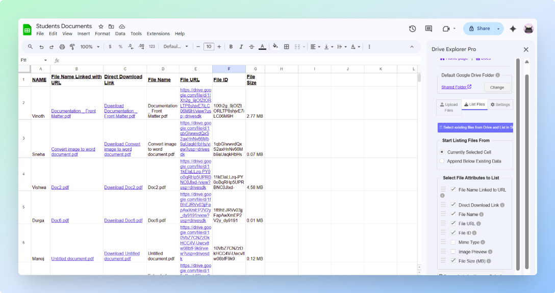Drive Explorer Pro is a Google Workspace add-on that runs in a sidebar inside Google Sheets. You can use it to upload many PDF files, add their links to your sheet, and log file details in separate columns.