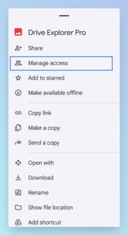- For Drive Explorer Pro: access to Google Sheets and permission to install Google Workspace add-ons