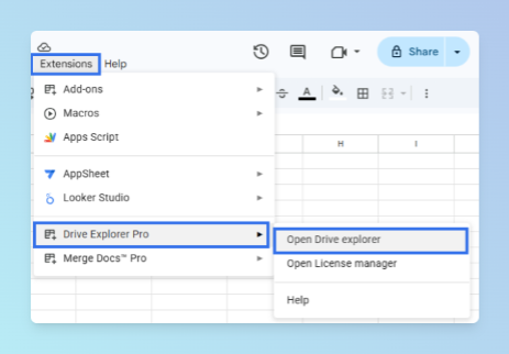 - The Drive Explorer Pro sidebar opens on the right side of your sheet.