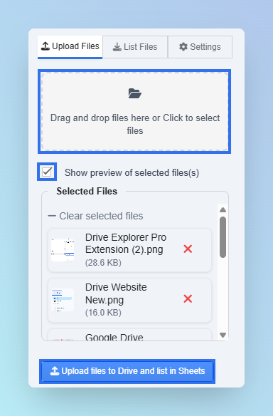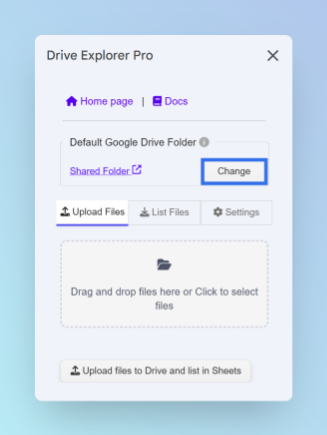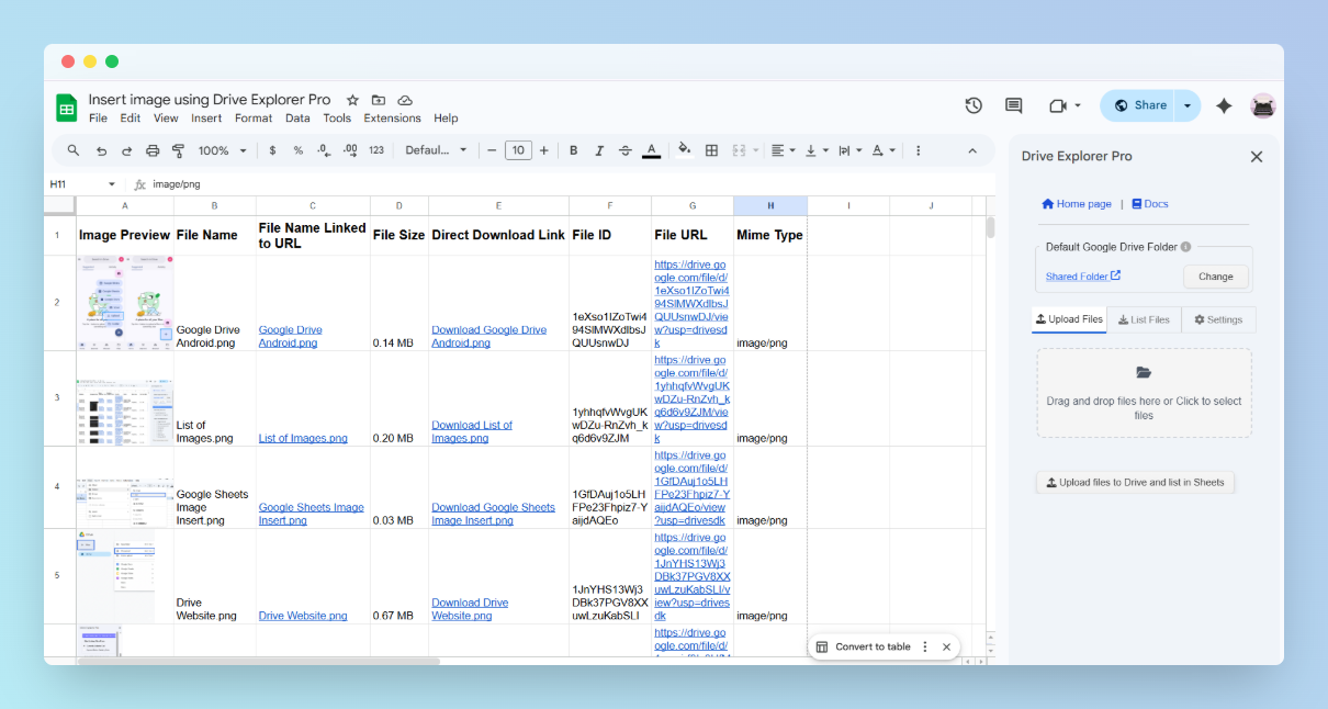 Drive Explorer Pro lets you upload files to Google Drive and automatically log their details, including shareable links into a Google Sheets spreadsheet.