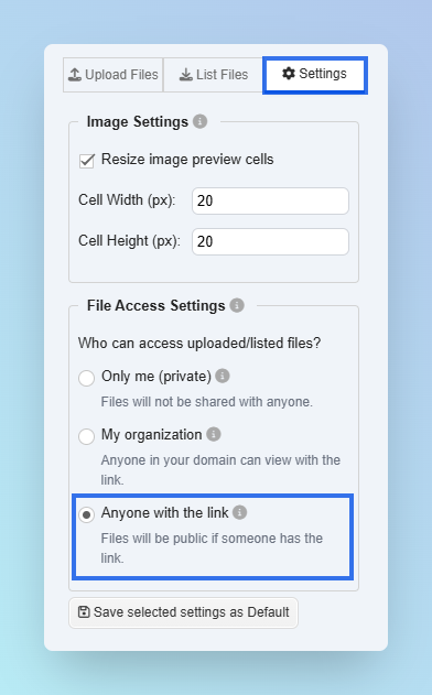 - Click Save Selected Settings as Default to keep these preferences for future uploads.