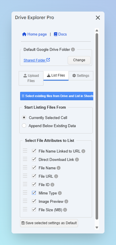 Set up which file details Drive Explorer Pro logs into your spreadsheet before you upload anything.